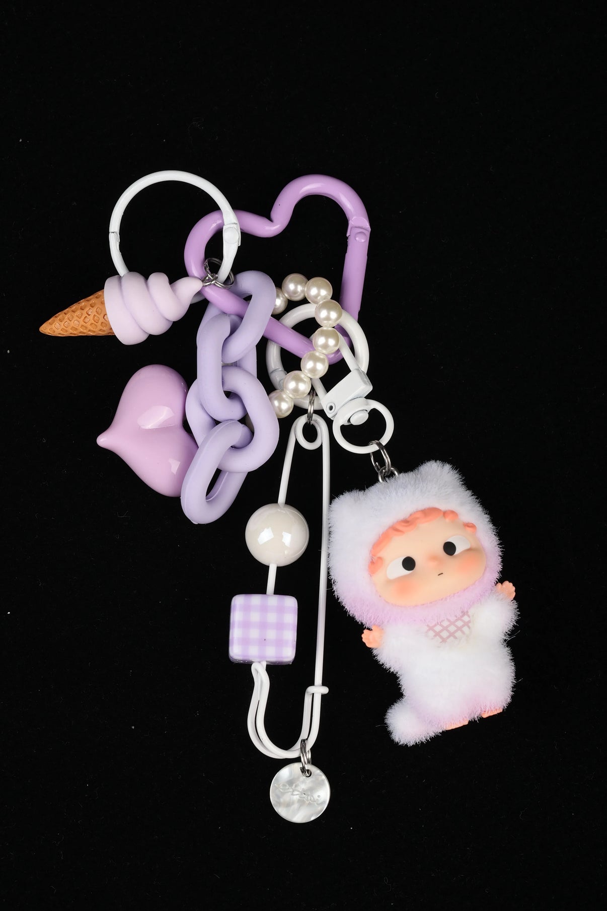 Soft lavender tones meet fluffy winter textures in this handmade charm, creating a piece that feels both nostalgic and otherworldly.