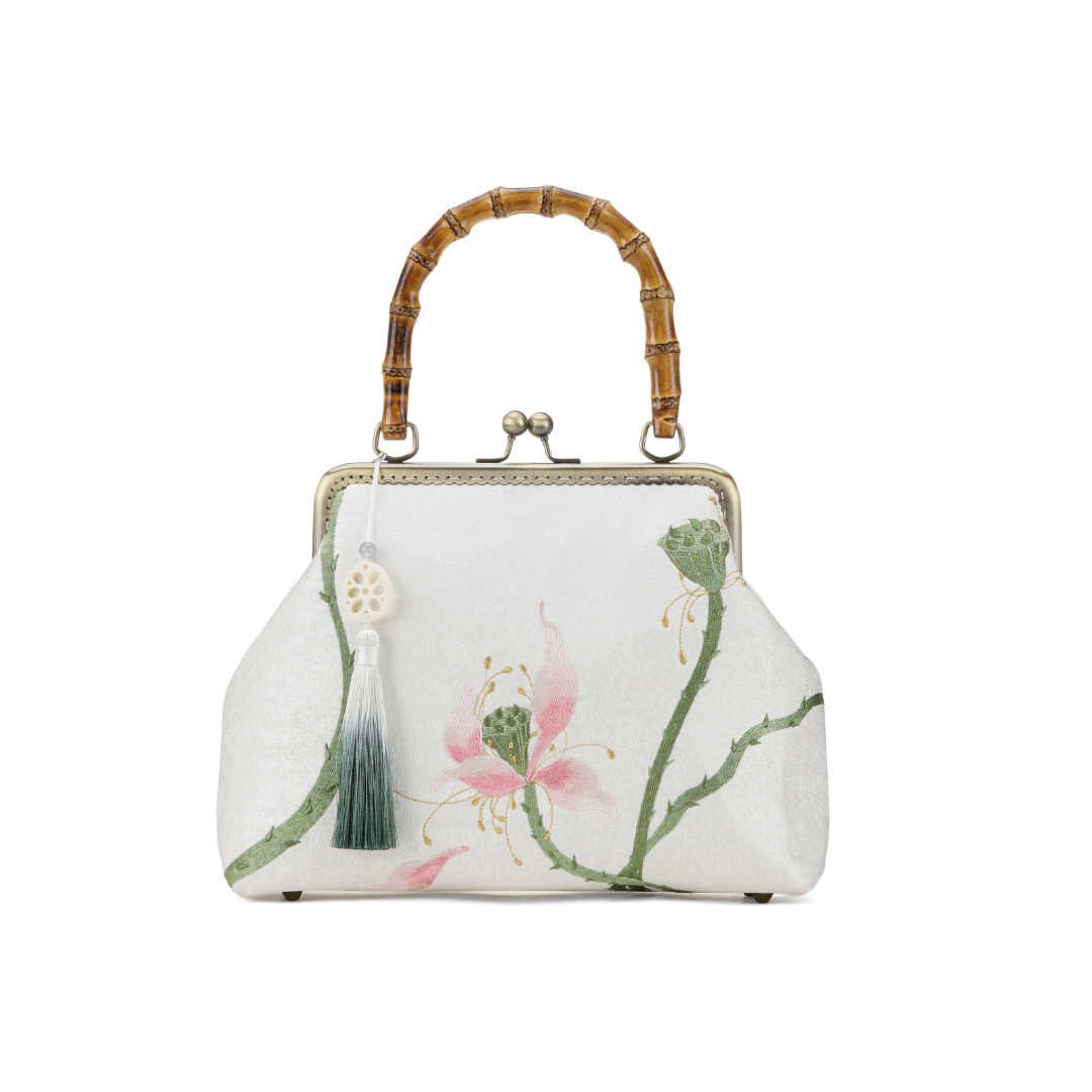 Featuring detailed silk-thread embroidery, the bag presents an elegant lotus and seedpod motif—a classic design in Chinese art.