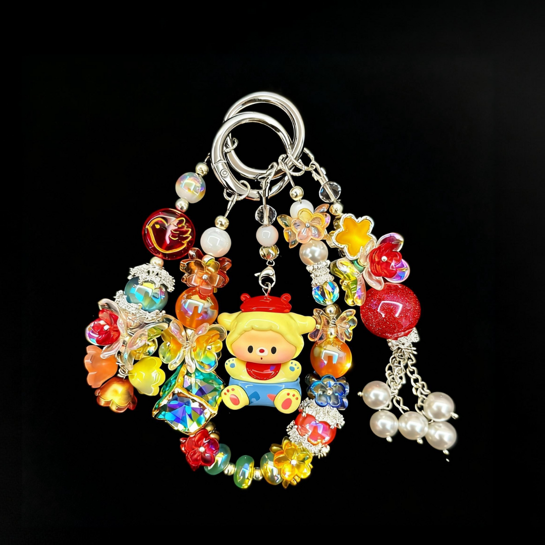But this charm is more than a colorful accessory. It is a talisman of optimism, hope, and emotional warmth. One day, a child feeling lonely held the charm in her hands. The Happy Moment seemed to awaken—the beads glimmered like laughter, the yellow doll smiled reassuringly, and the flower and pearl pendants swayed as if whispering encouragement. Slowly, her worries faded, replaced by delight and curiosity for the little wonders surrounding her.