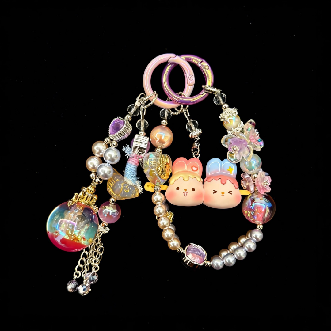 In a quiet little village nestled under the soft glow of a lavender moon, there lived a tiny doll named Peachy Moon Rabbits. Her beads faded from gentle pink to warm purple, shimmering softly in the night, and her twin rabbit ears stood perked, as if listening for whispers of the heart. Pearls and tiny heart charms jingled along her chain, carrying gentle magic meant to soothe and encourage.